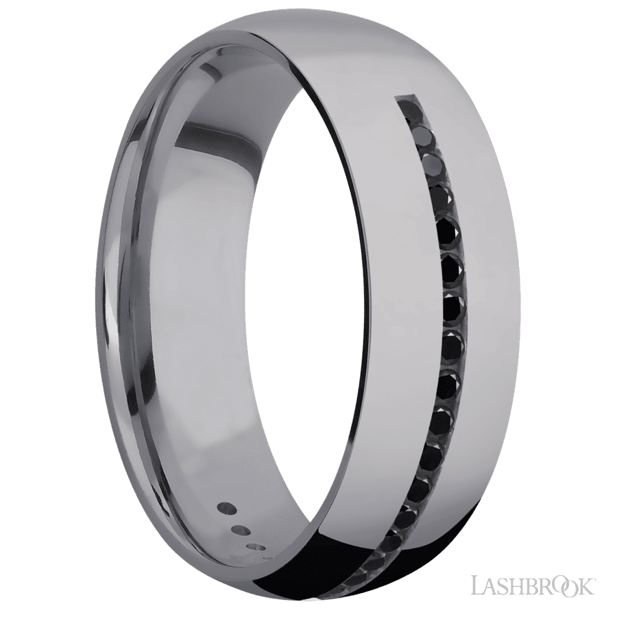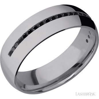 7 mm wide/Domed/Tantalum band with a Half Eternity arrangement of .015 carat Round Black Diamond stones in a Channel setting.