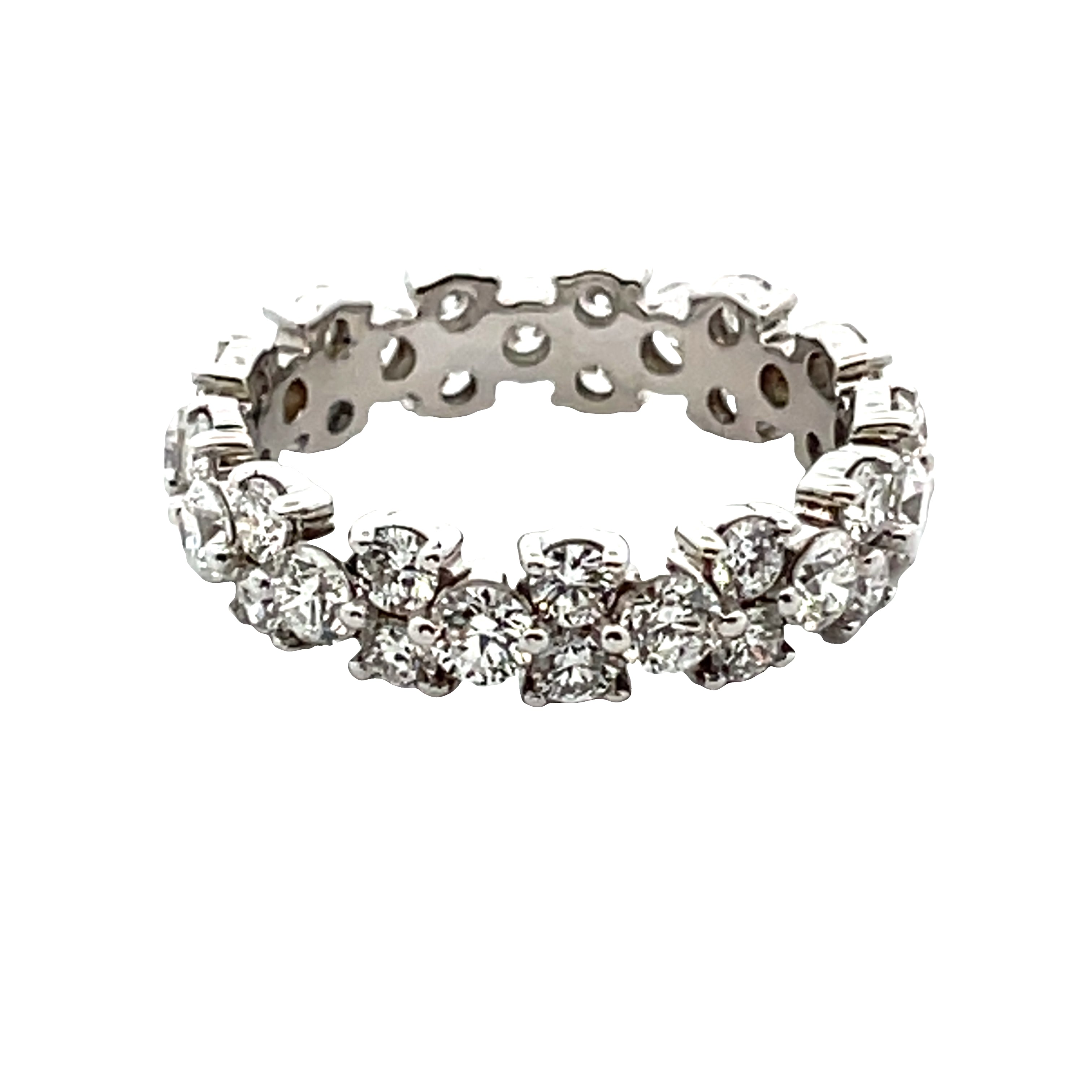 18Kt White Gold Diamond Eternity Style Ring. The Ring Contains 39 Round Brilliant Cut Diamonds With A Total Weight Of 2.52Cts. The Diamonds Have A Clarity Of Vs2-SI1 And Their Color Is G. All The Diamonds Are Prong Set.