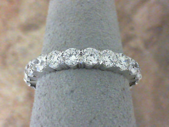 One platinum and diamond eternity wedding band featuring a highly polished finish and weighing 5.08 grams total weight. There are (22) diamonds, round brilliant cut, weighing 22=2.00 carats total weight, G-H color, VS2-SI1 clarity, and are prong set.