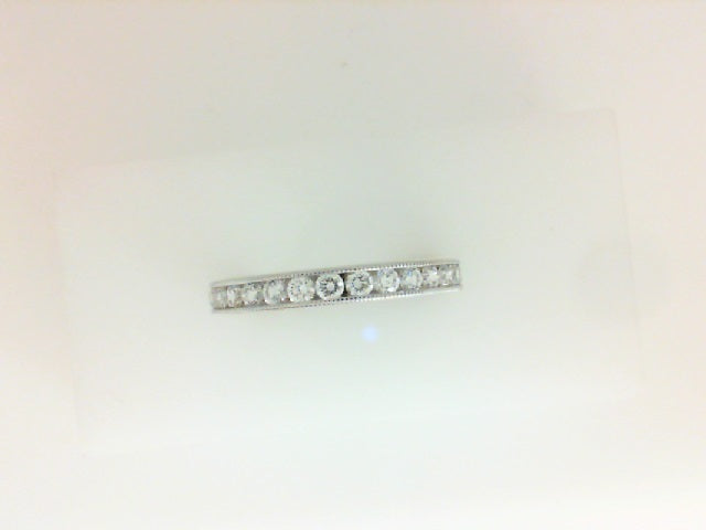 Ladly's diamond eternity band containing 1.00 carats total weight round brilliant diamonds, G-H color, VS-SI clarity set in 14k white gold with milgrain edge.