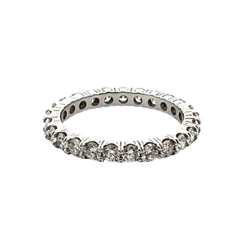 One lady’s platinum diamond eternity band containing twenty-four round brilliant cut diamonds. The diamonds are shared prong set weighing 1.35cttw color G-H and clarity VS2-SI1.