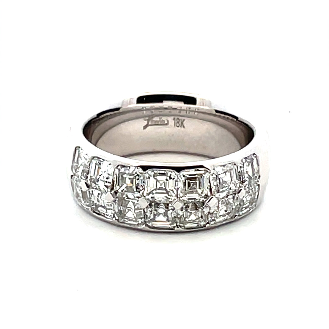 18KT WHITE GOLD 2 ROW DIAMOND BAND. THE RING CONTAINS 14 SQUARE EMERALD CUT DIAMONDS TOTALING 3.0CTS. THE DIAMONDS HAVE A CLARITY OF VS2-SI1 AND THE COLOR IS G.