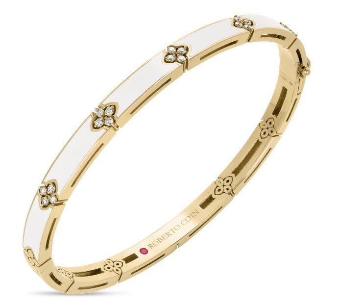 Elevate your style with this stunning 18K gold bangle from the Love in Verona collection. Featuring sparkling diamonds set against bold enamel, this piece effortlessly combines elegance with modern sophistication. Its sleek design makes it perfect for both everyday wear and special occasions, adding a touch of luxury that complements any outfit. Embrace timeless beauty and make a statement that lasts.
