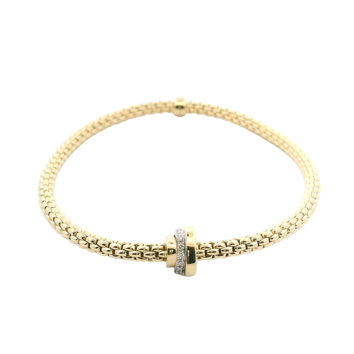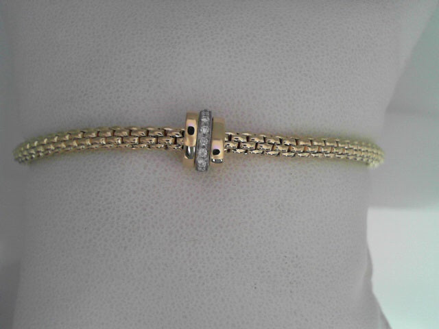 18KT YELLOW GOLD ROUNDED STRETCH LINK BRACELET WITH 2 PLAIN AND 1 DIAMOND RONDEL