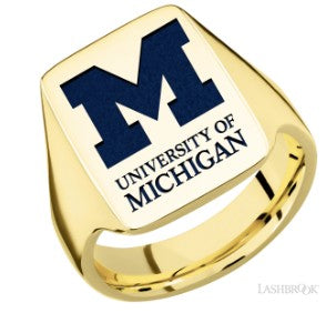 Large 20x14.5mm rectangle shape 10K yellow gold signet ring with thin tapered band and University of Michigan wordmark stacked engraving in blue accent. Price as shown for size 10