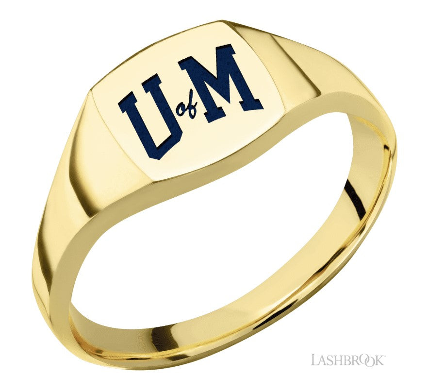 COLLEGIATE COLLECTION U of M Small 10K Yellow Gold Cushion Signet Ring with Blue Accent