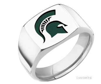 Medium 14mm cushion shape signet ring with wide band and Michigan State Spartan Helmet engraving in 10K white gold with green accent. Price as shown for size 10