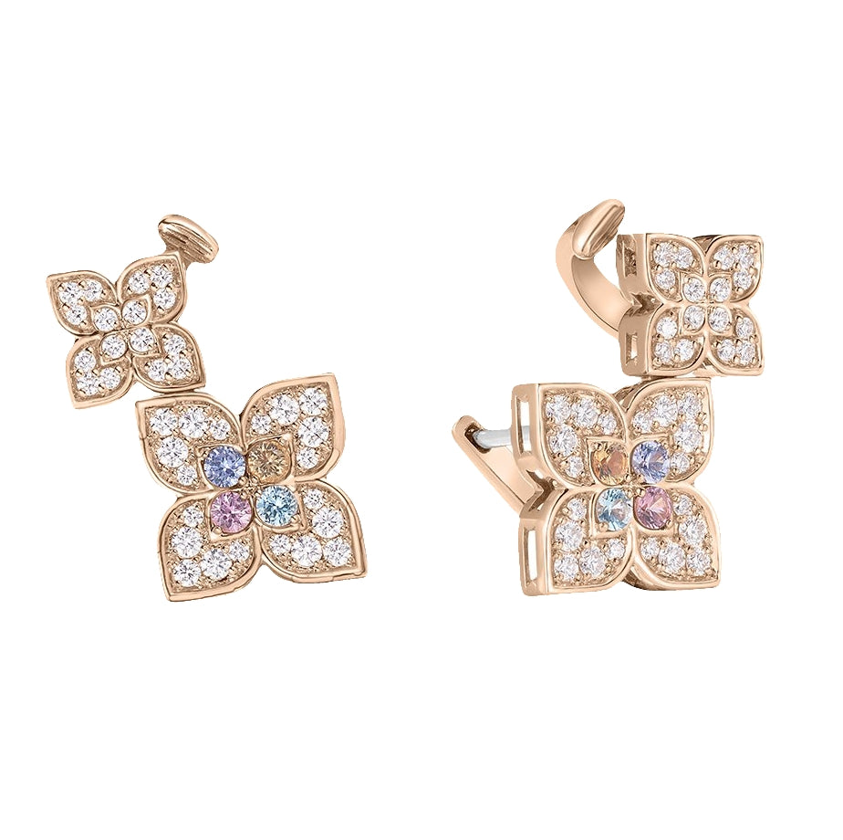 Elevate your look with the Venetian Princess Carnival Double Flower Climber Earrings in 18K rose gold, featuring approximately 0.55 TCW of diamonds. The design includes a small 10mm and large 15mm flower adorned with pavé diamonds and colorful mixed stones, gracefully climbing the ear for a striking, elegant effect.
