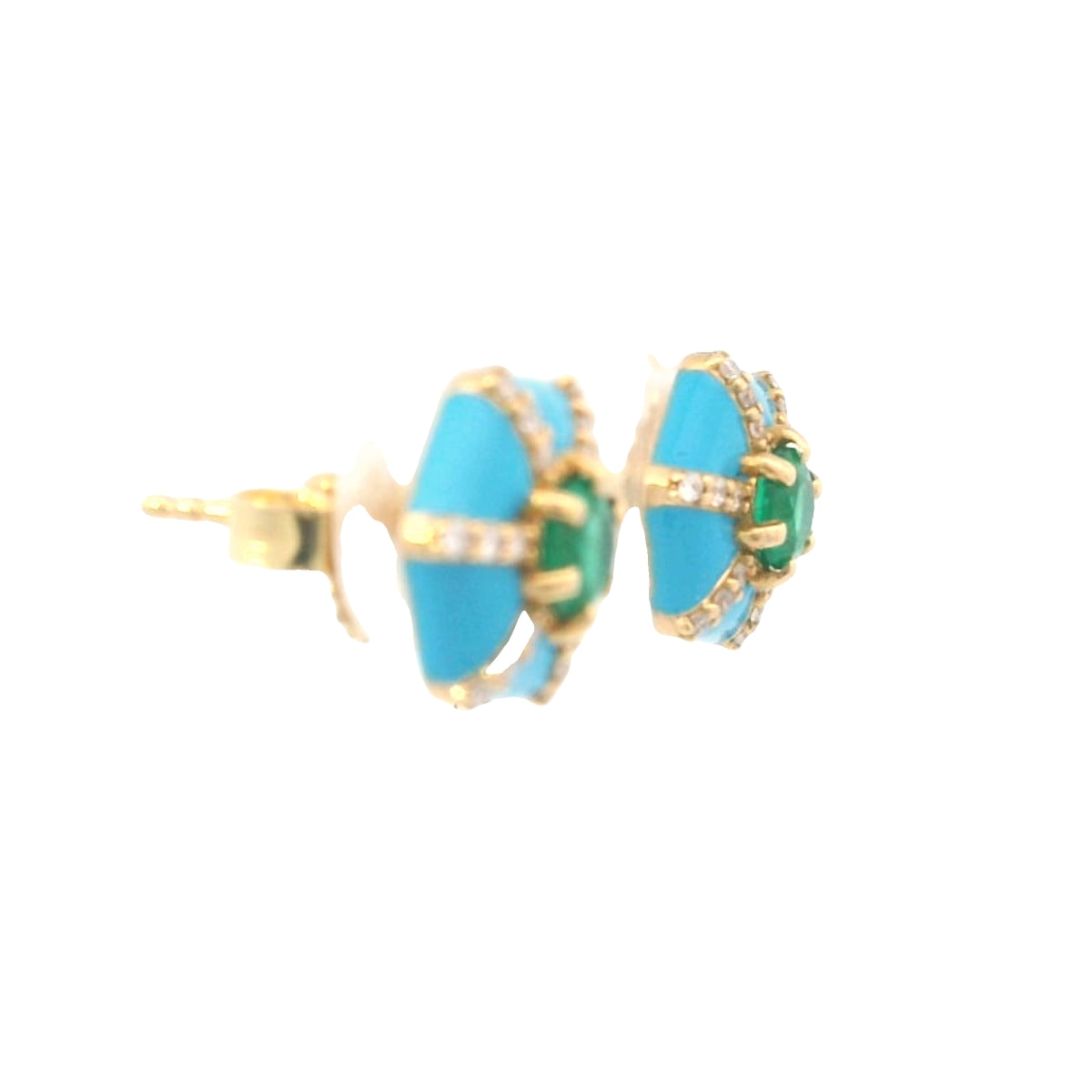 18KT YELLOW GOLD EMERALD AND TURQUOISE ENAMELED EARRINGS WITH DIAMONDS