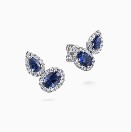 14K White Gold Toi Et Moi Sapphire And Diamond Halo Stud Earrings. The Earrings Contain 2 Oval And 2 Pear Shape Sapphires Totaling 1.64Cts. The Earrings Also Contain 60 Round Brilliant Cut Diamonds Totaling .36Cts