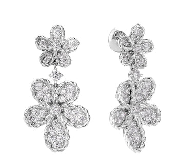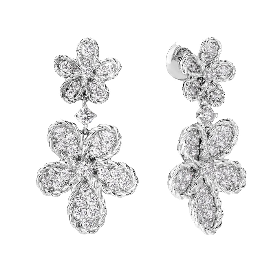 Elegant and radiant, these Jasmine earrings feature a double flower design crafted in luminous 18K white gold. Each bloom is adorned with pavé-set diamonds, creating a sparkling cascade that highlights delicate movement and exquisite Italian craftsmanship. Perfect for adding a touch of refined sophistication and timeless elegance to any ensemble.