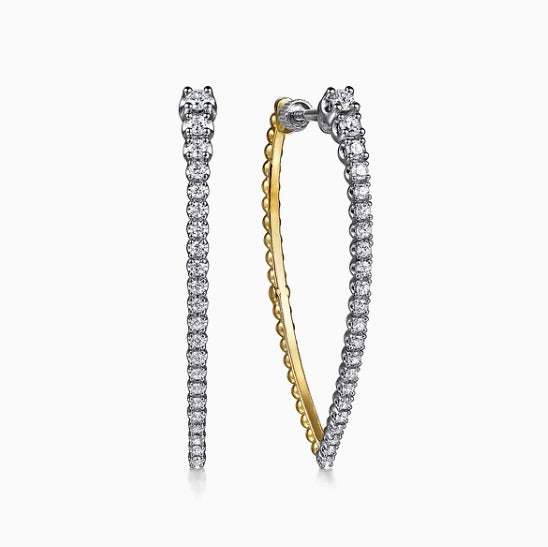 14K White And Yellow Gold Bujukan And Graduating Diamond Classic Hoop Earrings. The Pointed Hoops Contain 44 Round Brilliant Cut Diamonds Totaling .74Cts. The Diamonds Have A Clarity Of Si2 And The Color Is G