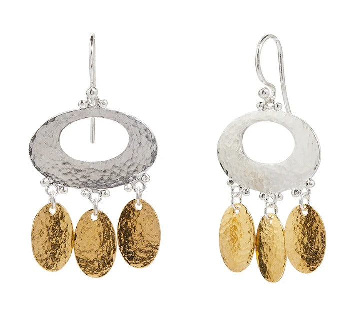 STERLING SILVER CHANDELIER DROP EARRINGS, 3 DANGLING OVAL FLAKES, WIRE HOOK, GOLD ACCENTS
