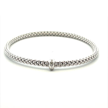 18Kt White Gold Flexable Link Bracelet With 1 Round Brilliant Cut Diamond Weighing .01cts. The Diamond Has A Clarity Of VSs And The Color Is G/H.