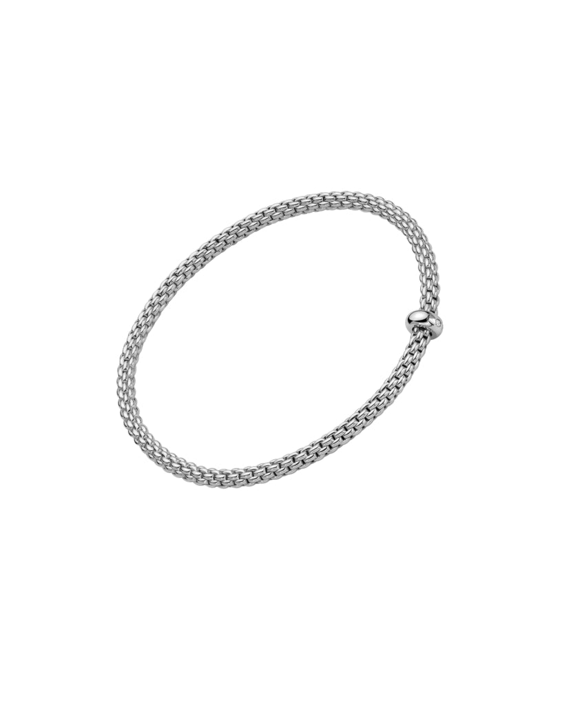 18KT white gold flexable link diamond bracelet. The bracelet contains 1 round brilliant cut diamond weighing .01cts.