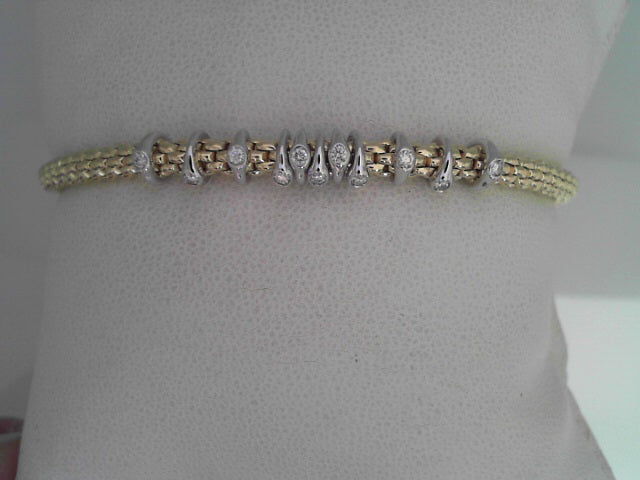 18Kt Yellow Gold Rounded Stretch Link Bracelet With 11 White Gold Diamond Rondels. The Bracelet Is Part Of Fope's Prima Collection And Contains 11 Round Brilliant Cut Diamonds Totaling .15cts. The Diamonds Have A Clarity Of VS1-VS2 And The Color Is G.