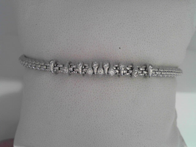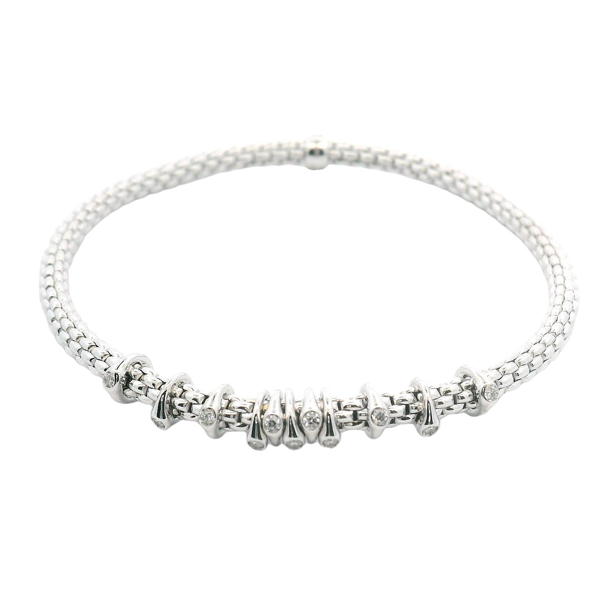 18Kt White Gold Rounded Stretch Link Bracelet With 11 Diamond Rondels. The Bracelet Is Part Of Fope's Prima Collection And Contains 11 Round Brilliant Cut Dimaonds Totaling .15cts. The Diamonds Have A Clairty Of VS1-VS2 And The Color Is G.