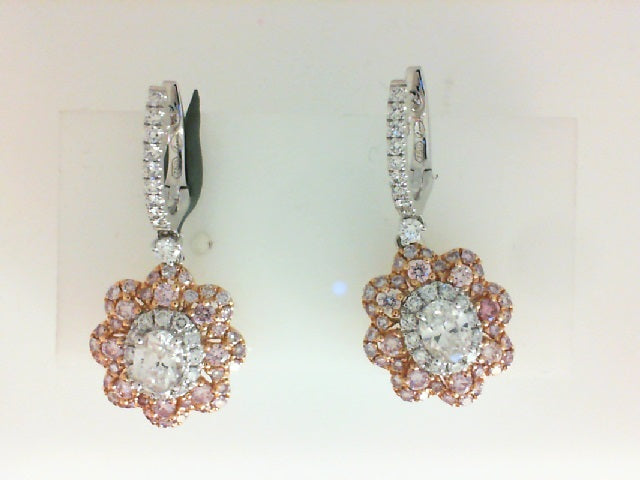 One lady's pair of 18kt white and rose gold diamond earrings containing forty-four diamonds, round brilliant cut weighing 0.63 carats total color G-H and clarity SI1-SI2. Eighty pink diamonds, round brilliant cut weighing 1.29 carats total. Two diamonds, oval cut measuring 5.59 x 4.28mm and weighs 0.96 carats total color H-I and clarity SI2.