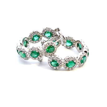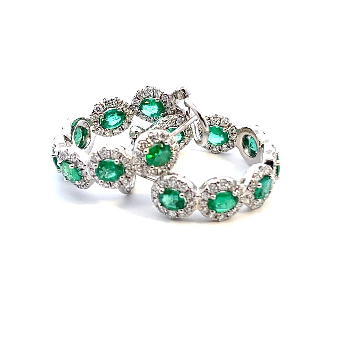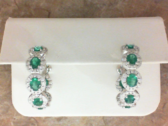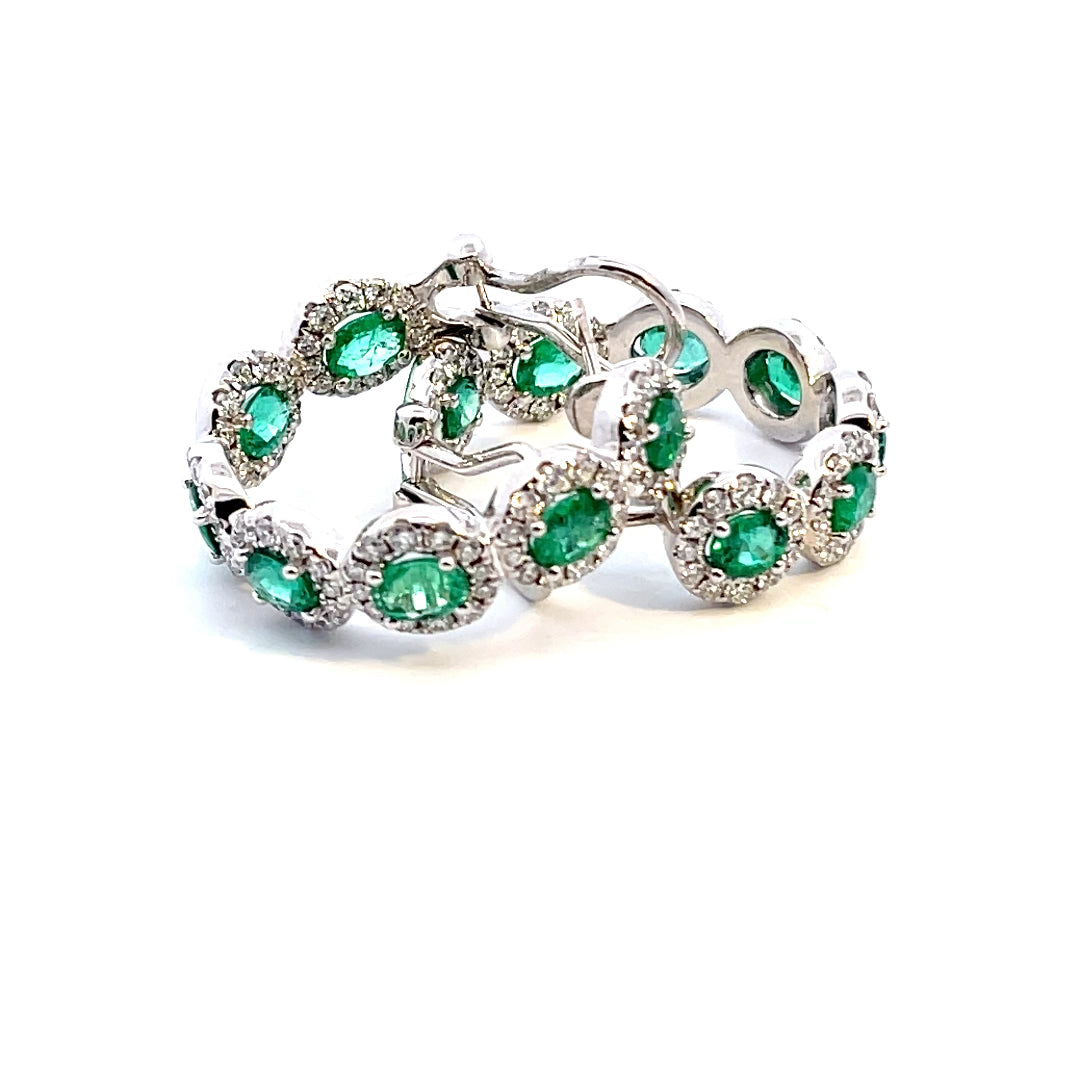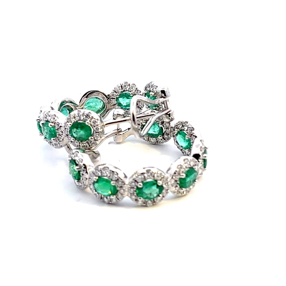 One pair of 18 karat white gold emerald and diamond earrings. Each earring contains forty two round brilliant cut diamonds weighing (84) = 2.04 carats total, G in color VS in clarity and seven oval emeralds weighing (14) = 3.67 carats total, bright medium green in color, SI1 in clarityl. The earrings have a high polish finish, lever backs and each weighs approximately 8.3 grams.