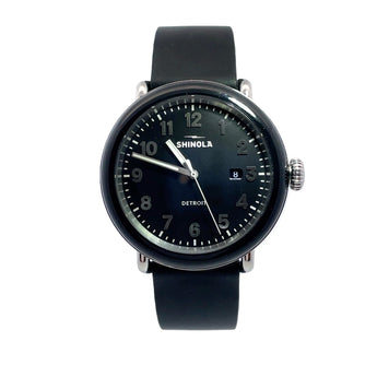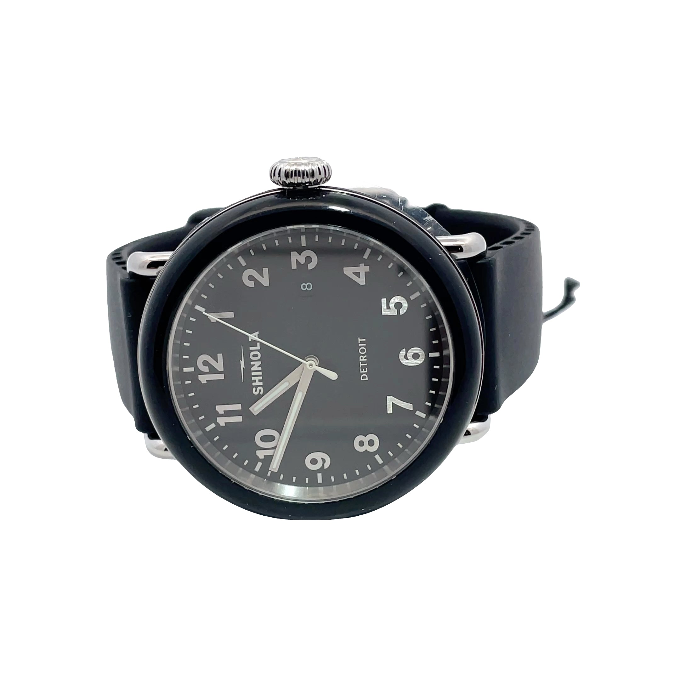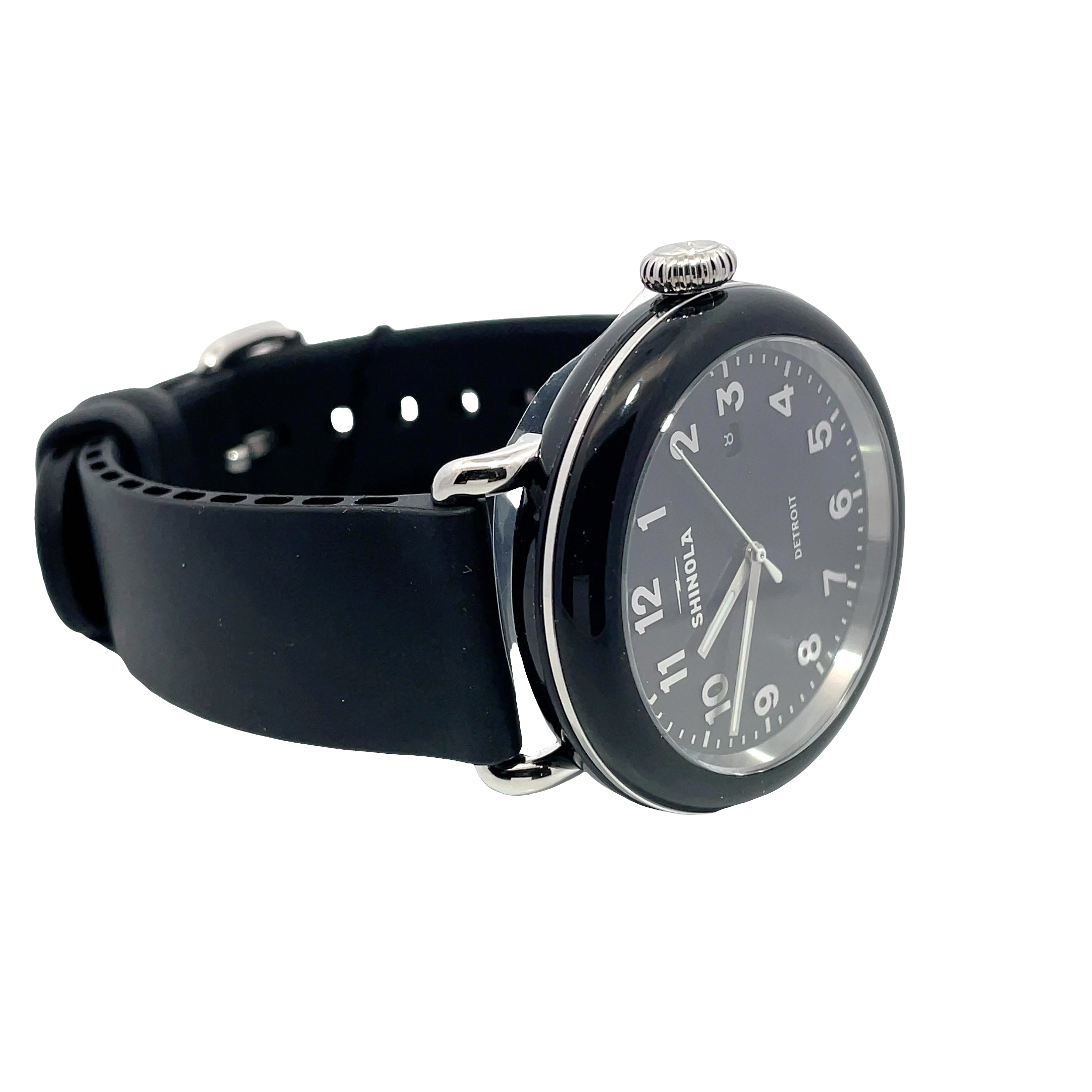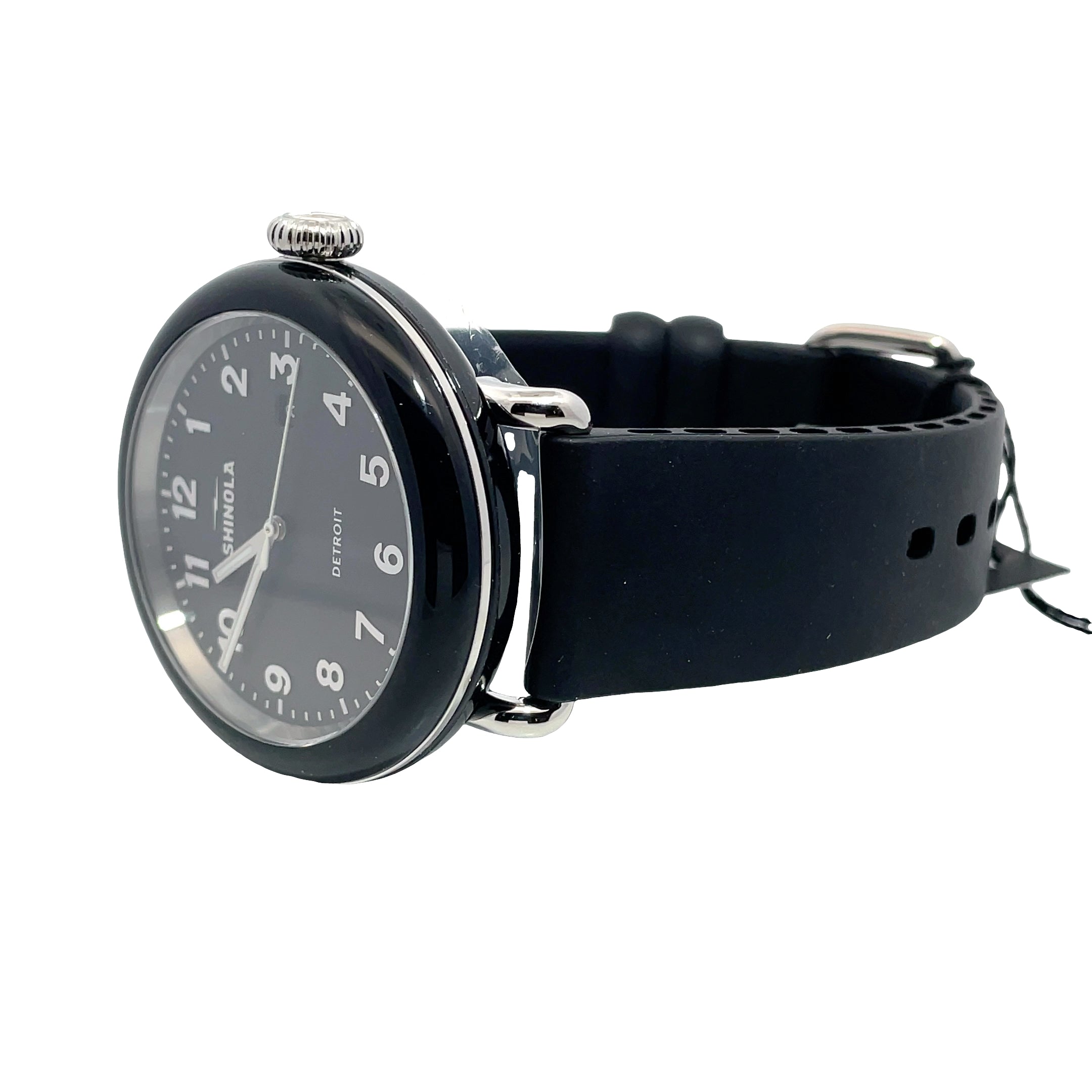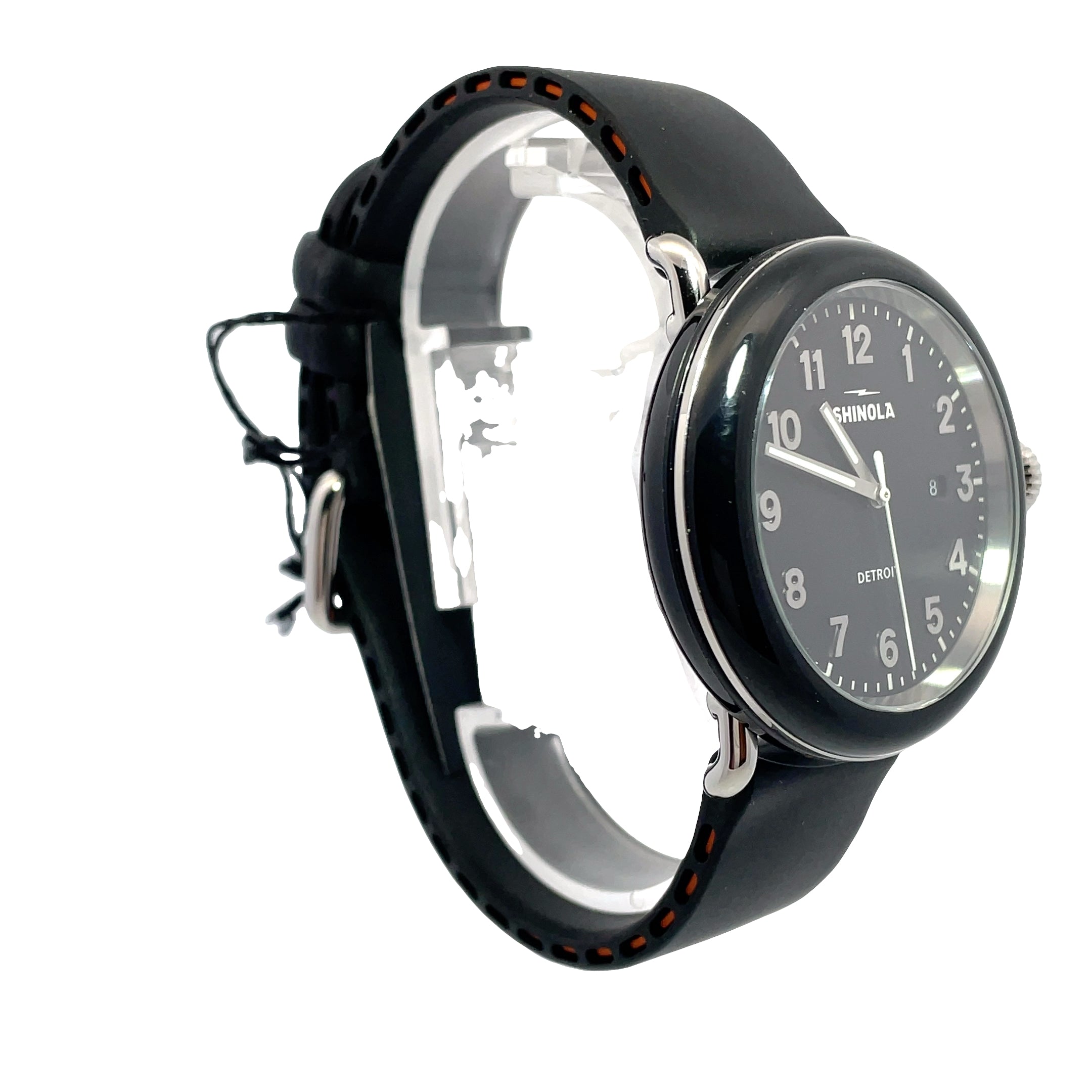 THE SHINOLA DETROLA 41 MM BLACK RUBBER (MODEL S0120307640-1-BLK-41-USA) IS A SLEEK, LIGHTWEIGHT TIMEPIECE CRAFTED WITH A STAINLESS STEEL CORE ENCASED IN DURABLE BLACK TR90 RESIN FOR BOTH STRENGTH AND WATER RESISTANCE. ITS BLACK DIAL FEATURES SILVER ARABIC NUMERALS AND SUPER-LUMINOVA–COATED HANDS, WHILE THE BLACK FKM RUBBER STRAP IS ACCENTED BY A SUBTLE POP OF SHINOLA’S SIGNATURE ORANGE. POWERED BY THE ARGONITE 705 QUARTZ MOVEMENT, IT OFFERS RELIABLE EVERYDAY PERFORMANCE IN A BOLD DETROIT-DESIGNED PACKAGE.