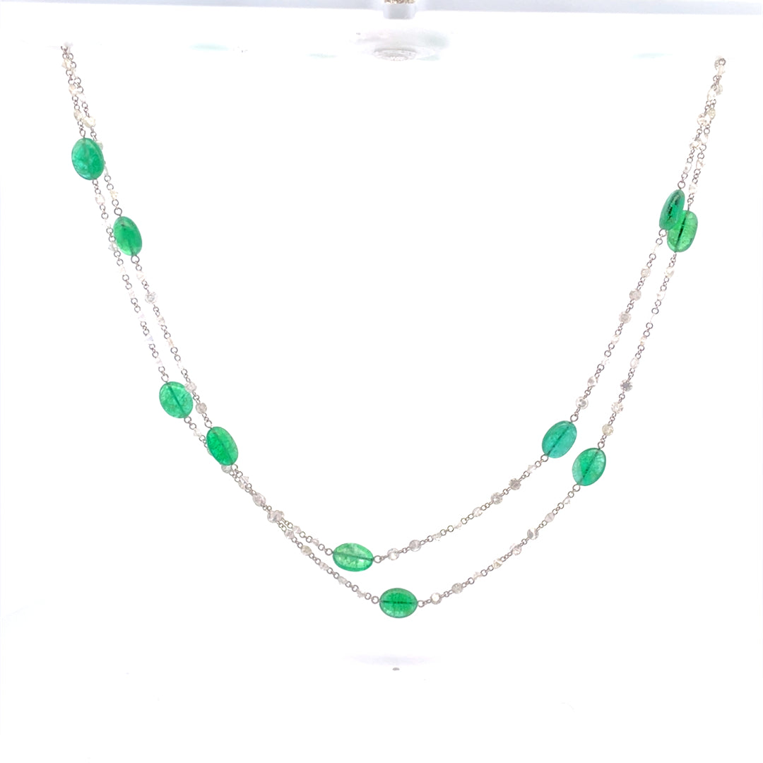 One platinum diamond and emerald necklace containing twenty oval emeralds, one hundred sixty round brilliant cut diamonds weighing 11.61 carats total, G-H in color, I in clarity and fifty four single cut diamonds weighing 0.20 carats total, H-I in color, SI2-I1 in clarity. The necklace weighs 12.9 grams, is 40 inches in length and has an 18 karat white gold clasp.