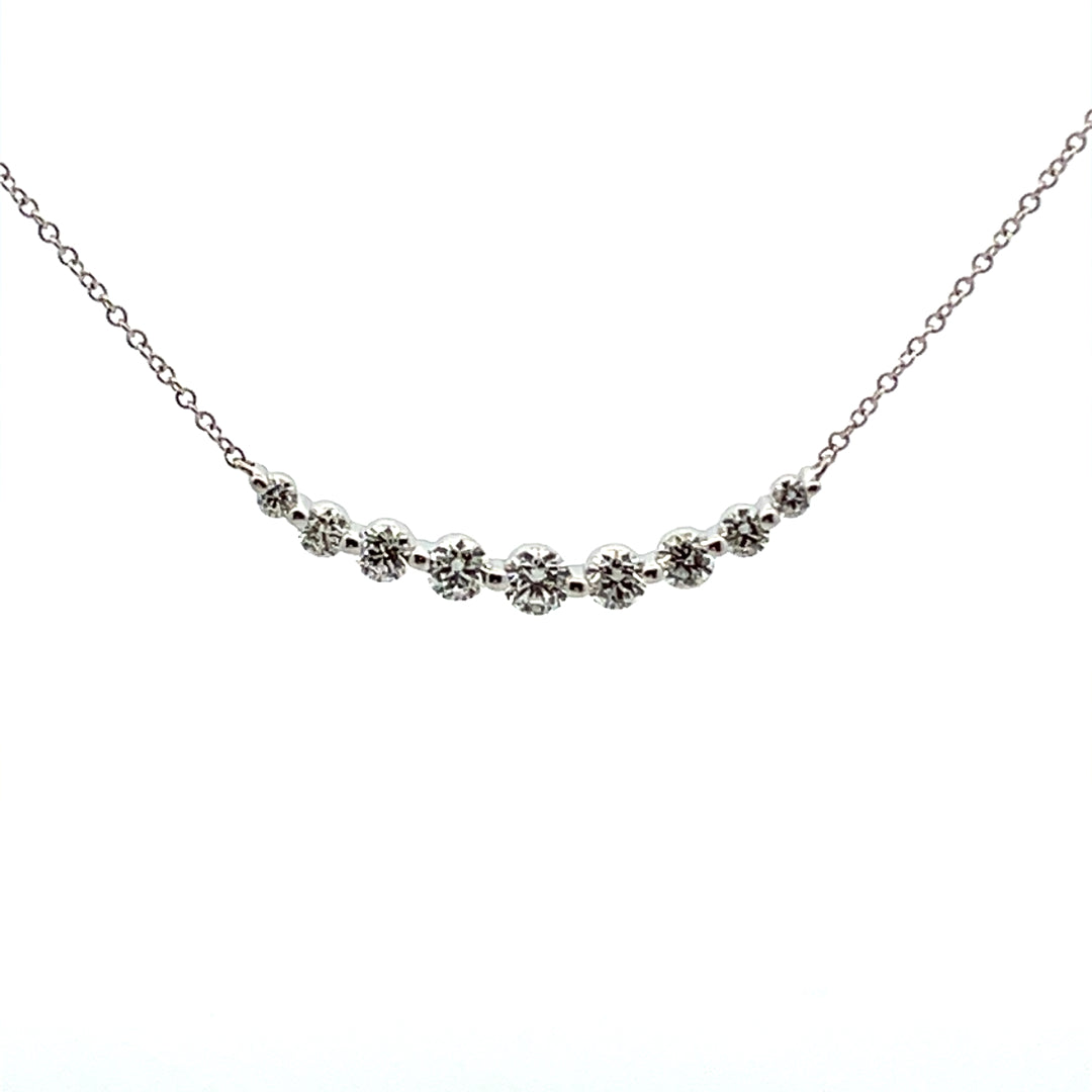 19" 18KT WHITE GOLD DIAMOND FASHION NECKLACE. THE NECKLACE CONTAINS 9 ROUND BRILLIANT CUT DIAMONDS TOTALING .85CTS. THE DIAMONDS HAVE A CLARITY OF VS2-SI1 AND THE COLOR IS G.