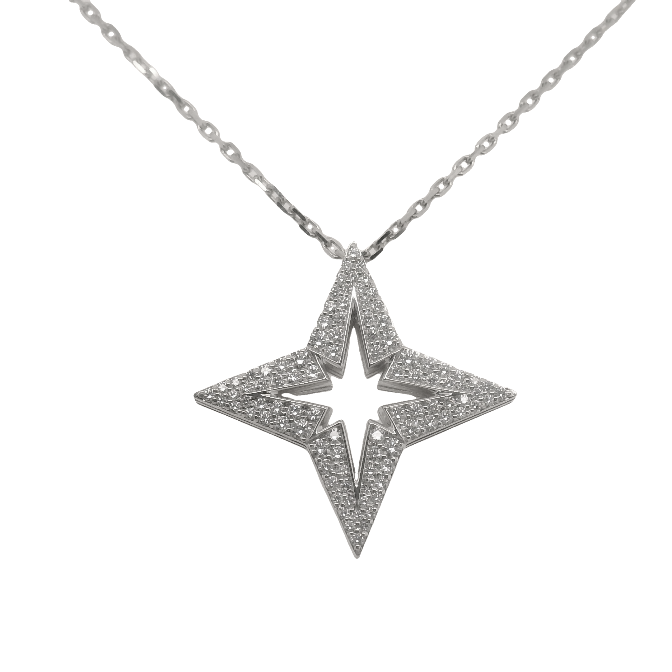 18" 18K White Gold Stardust Diamond Star Pendant. The Necklace Contains 97 Round Brilliant Cut Diamonds 0.70cttw. The Diamonds Are Graded G-H Color, SI1-SI2 Clarity