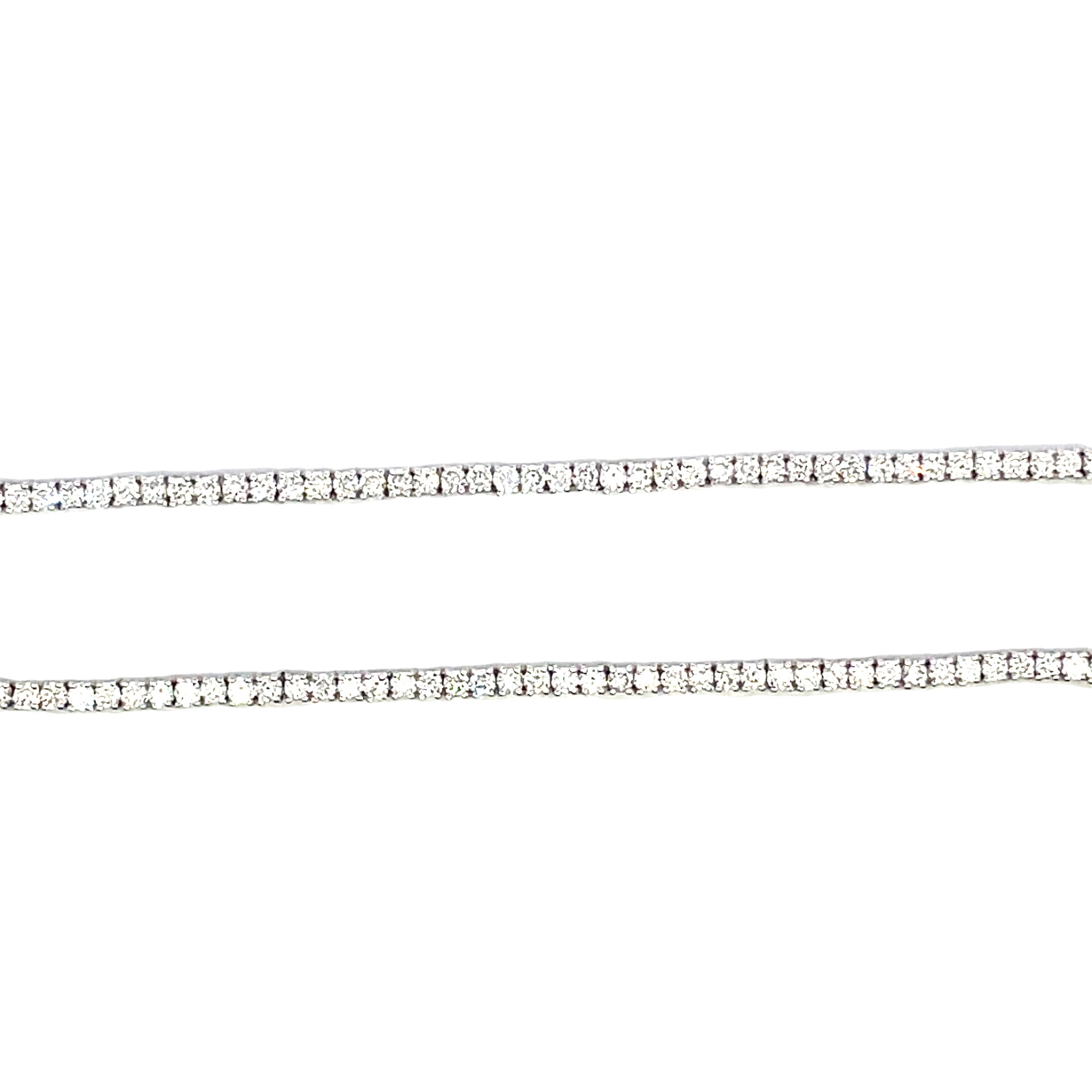 17" 14K White Gold Lab Created Diamond Tennis Necklace. The Necklace Contains 260 Round Lab Grown Diamonds Totaling 5 Cts. The Stones Are Set In 4 Prong Seting Style.