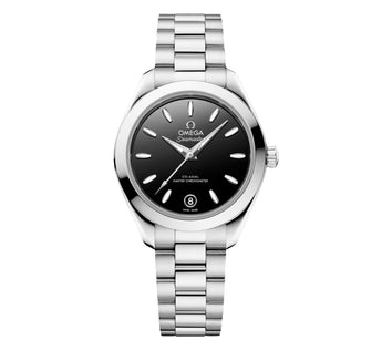 The watch is presented on an integrated stainless steel bracelet with beautifully rounded polished-brushed links, a foldover butterfly clasp, and OMEGA’s easy comfort-adjustment system.