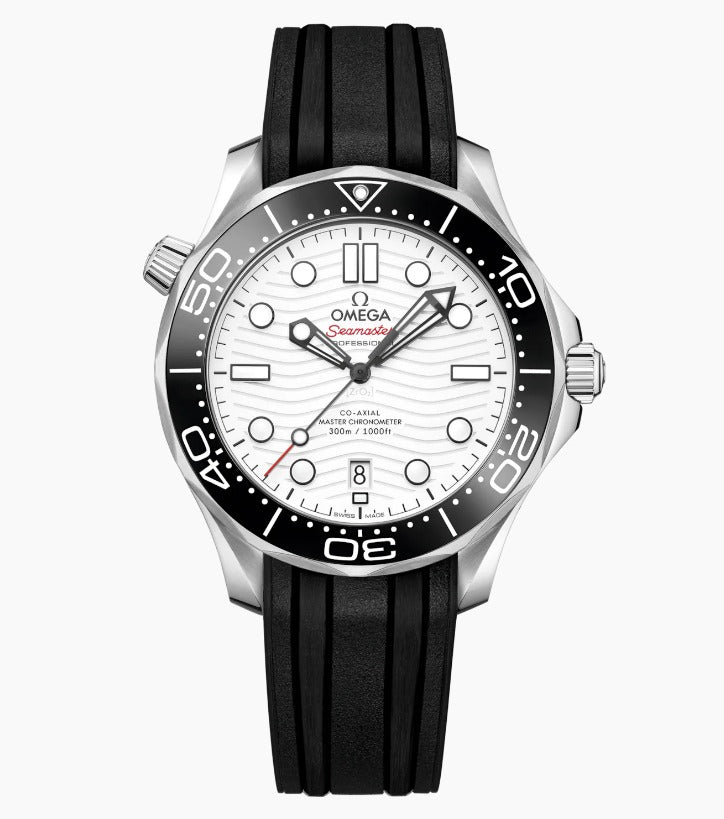 This 42 mm model is crafted from stainless steel and includes a black ceramic bezel with a white enamel diving scale. The dial is polished white ceramic and features laser-engraved waves and Seamaster highlighted in red.