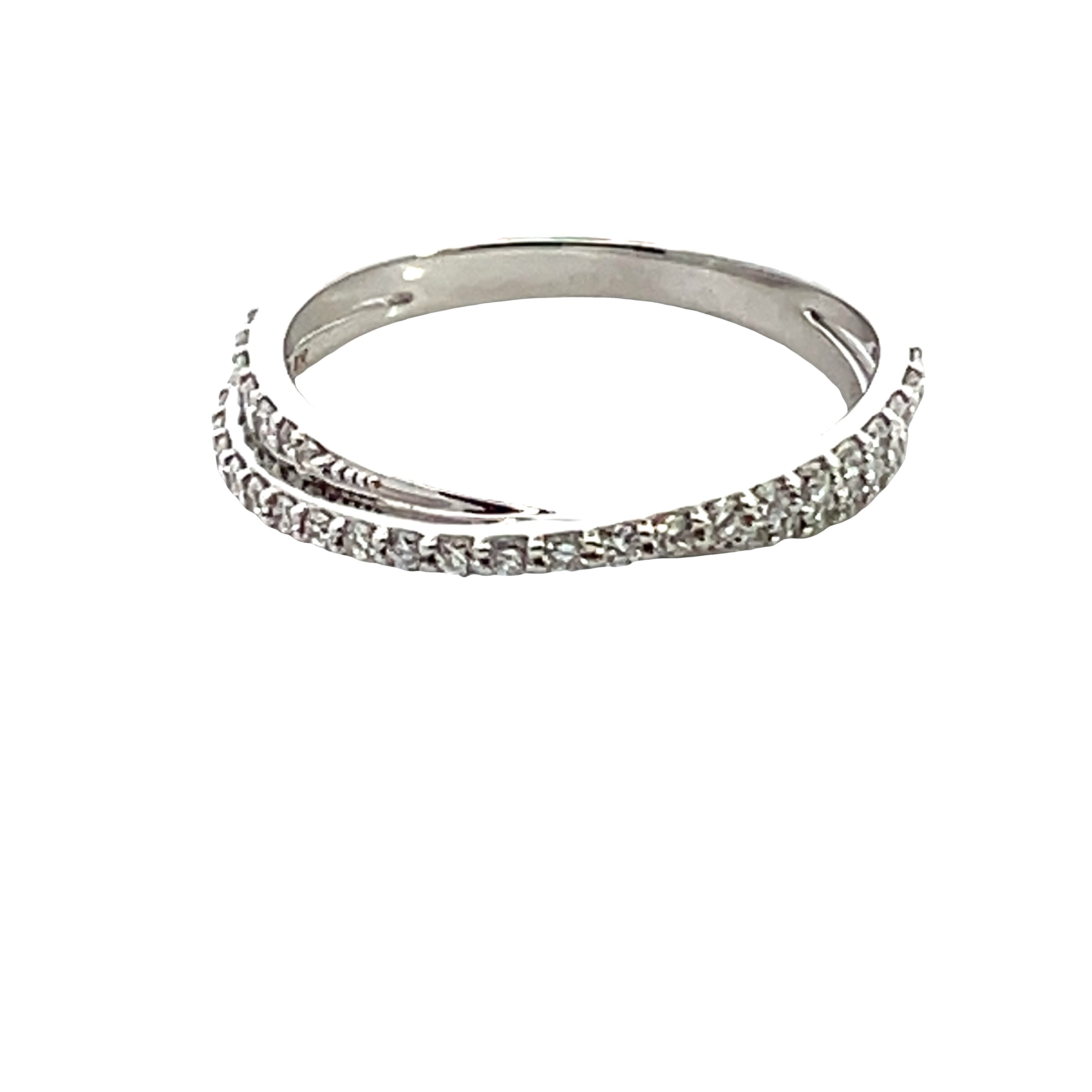 14Kt White Gold Diamond Crossover Band. The ring contains 37 Round Brilliant Cut Diamonds Totaling .35Cts