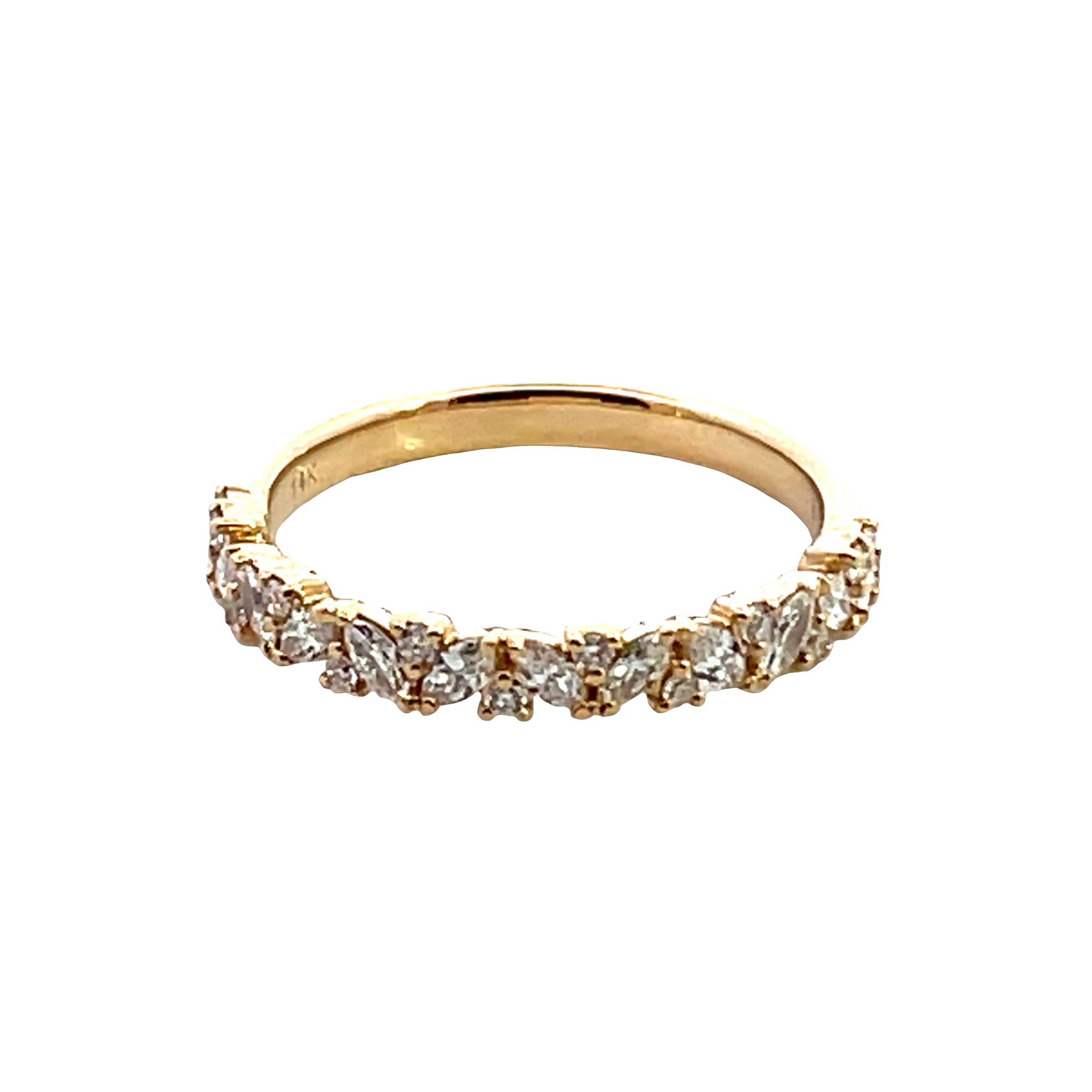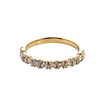 14Kt Yellow Gold Diamond Band With Round And Marquise Cut Diamonds. The ring contains 13 Round Brilliant Cut Diamonds Totaling .12cts and 12 Marquise Cut Diamonds Totaling .44cts.