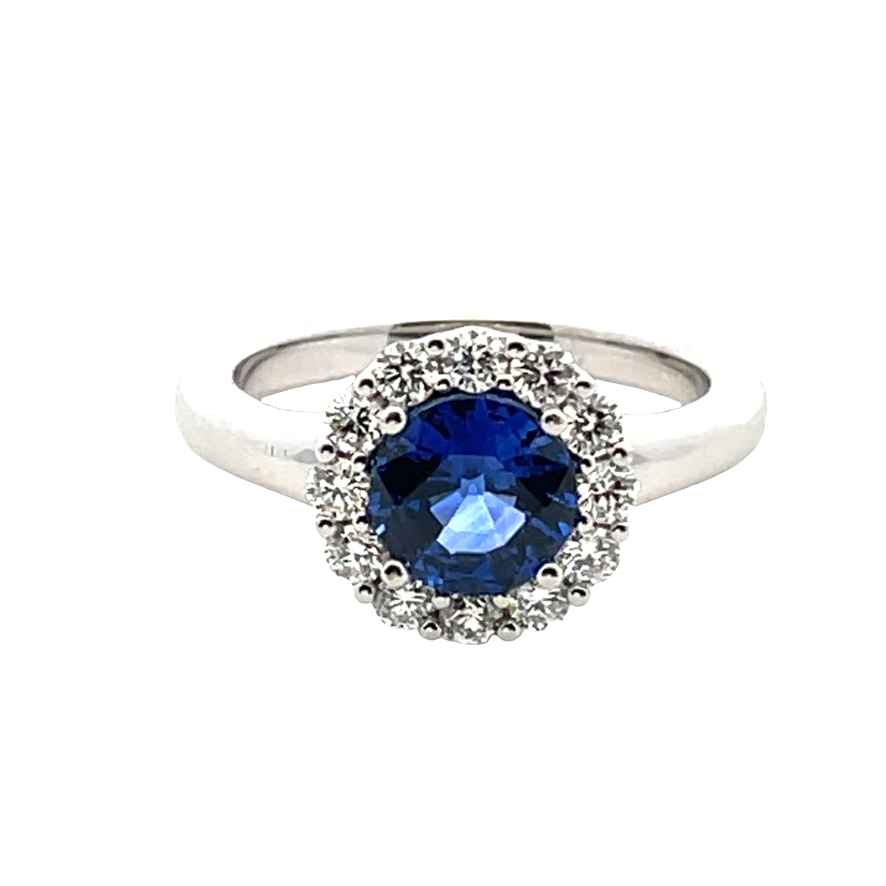 18Kt White Gold Sapphire And Diamond Fashion Ring. The Ring Contains 1 Round Sapphire Weighing 1.62Cts And 12 Round Brilliant Cut Diamonds Totaling .48Cts. The Diamonds Have A Clarity Of Vs2-Si1 And The Color Is G/H