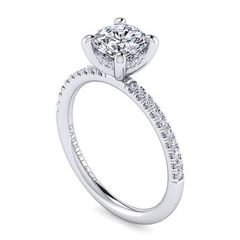 14Kt White Gold Diamond Semi Mounting. The Ring Is Designed By Gabriel & Co And Is Part Of Their Classic Collection. The Ring Contains 32 Round Brilliant Cut Diamonds Totaling .19cts. They Have A Clarity Of SI2 And The Color Is G.