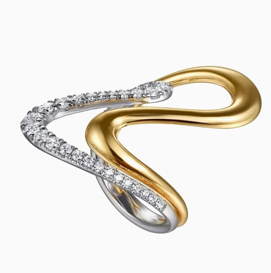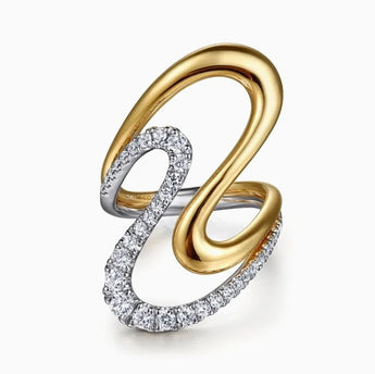 14K White & Yellow Gold Graduating Diamond Twisted Ring. The Ring Contains 33 Round Brilliant Cut Diamonds Totaling .74Cts