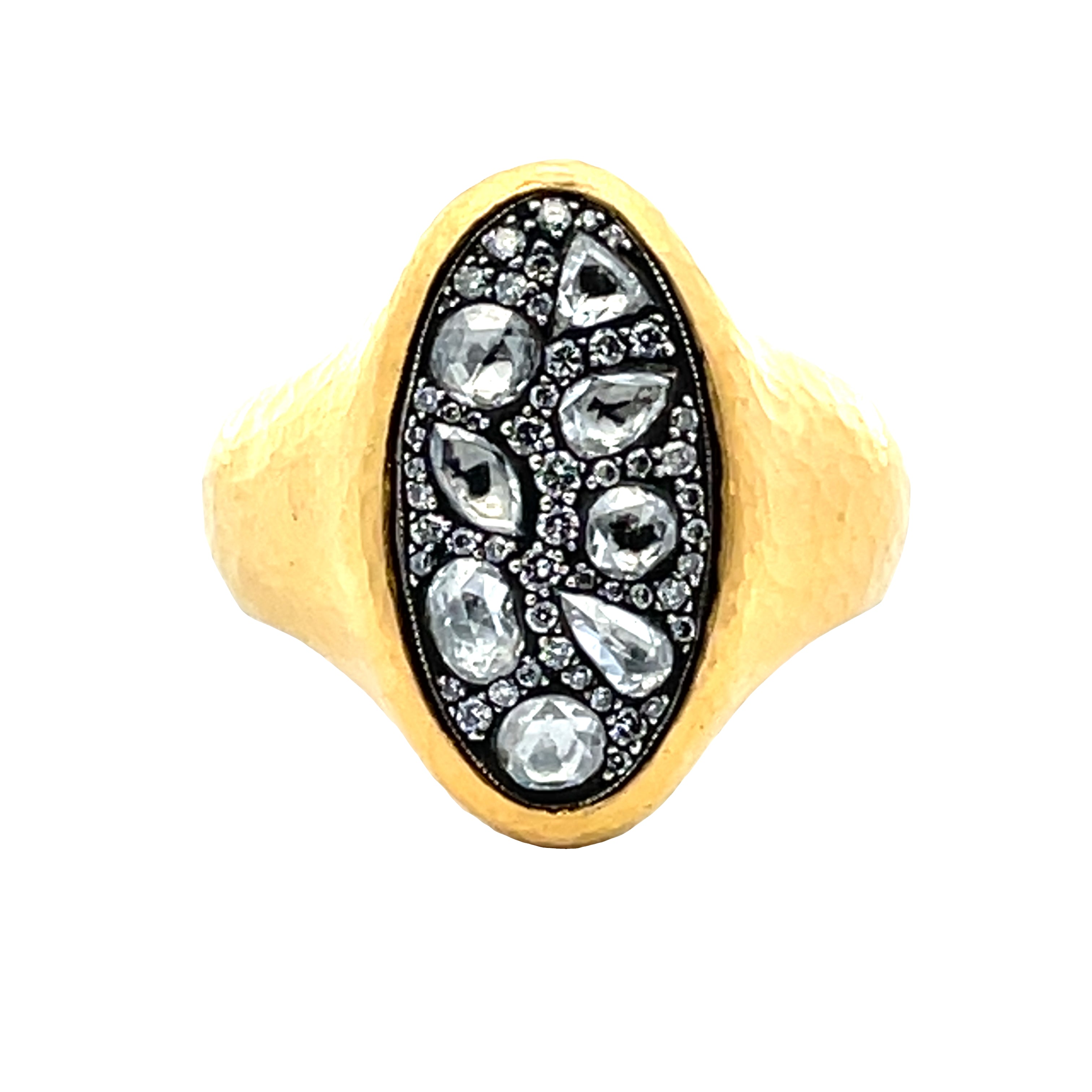 24KT GOLD RING WITH AN OVAL TOP WITH PAVE SET DIAMONDS