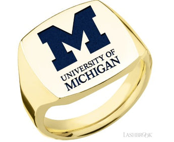 Large 18mm cushion shape10K yellow gold signet ring with thin tapered band and University of Michigan wordmark stacked engraving in blue accent. Price as shown for size 10
