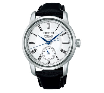 Presage Craftsmanship Series Enamel. Offering the finest in Japanese mechanical watchmaking, the Presage Collection blends precision technology with superior craftsmanship and design. In glossy white enamel with blue accents, the beautifully finished dial features a 24-hour subdial at 6 o’clock and curved hands providing a soft, luxurious impression. The thin roman numerals give a minimal, elegant, and contemporary impression while the crescent accent at the end of the second hand symbolizes the moon, a traditional element of Japanese art. The 24-jewel automatic movement beats at a frequency of 21,600 vibrations per hour, with a power reserve of 72 hours and manual winding capability. Crafted of stainless steel with super-hard coating, and paired with a black leather strap, this extraordinary timepiece includes a dual-curved anti-reflective sapphire crystal and a tri-fold push-button release clasp. 10 bar, 100M Water Resistant