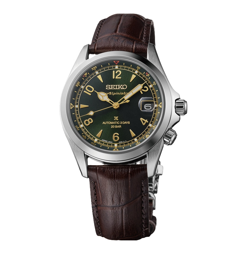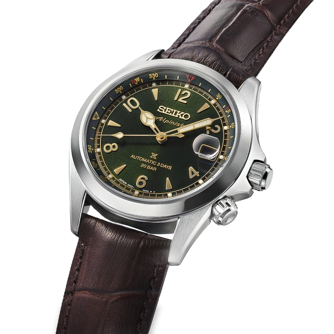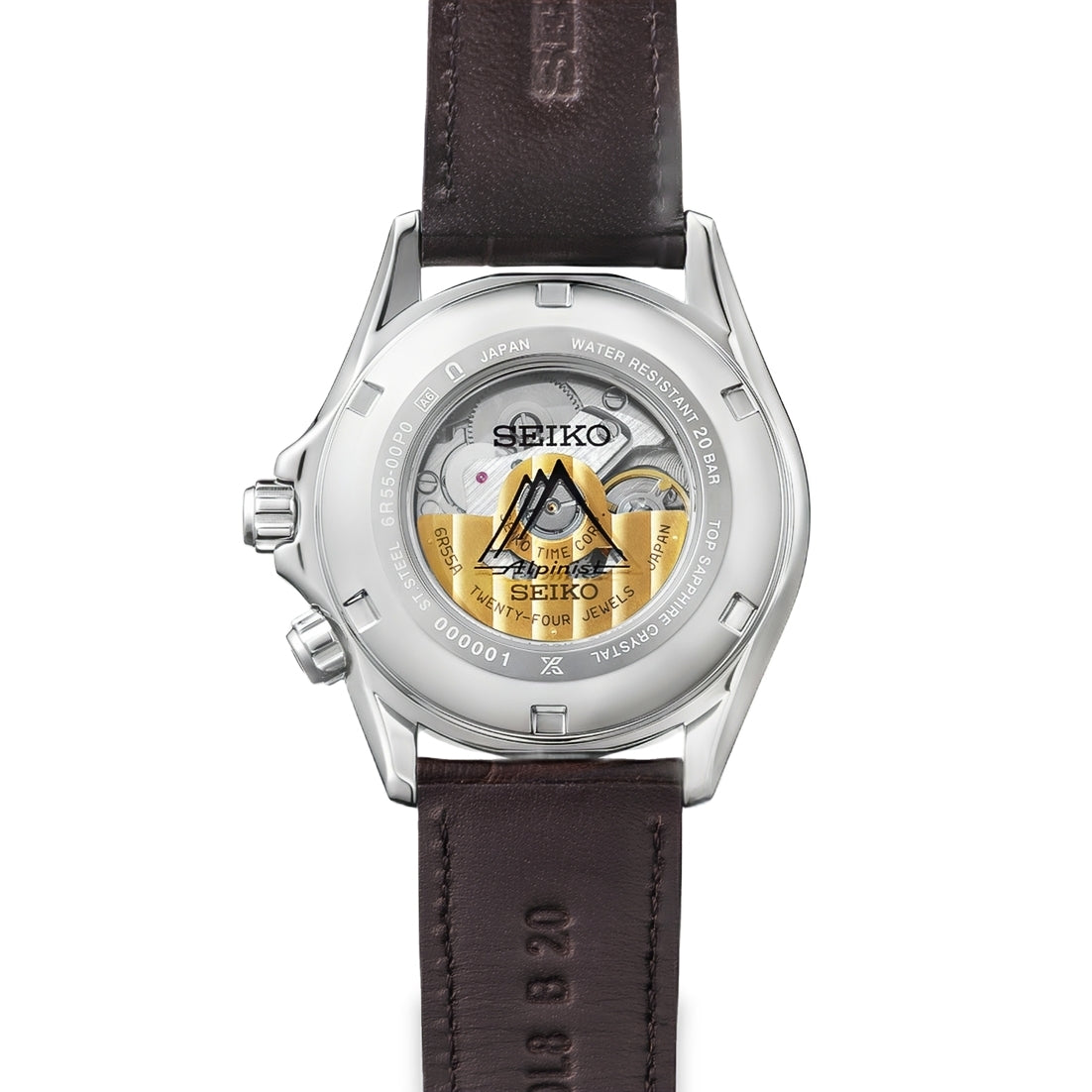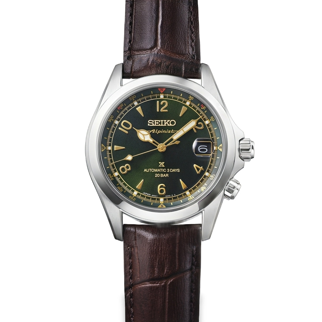 Prospex Alpinist. Seiko Prospex challenges every limit with timepieces created to exceed expectations, engineered with superior style and innovative technology for the sea, sky or land. Driven by a heritage of iconic design, Prospex continues to keep going forward with excellence in precision timekeeping, crafted for the modern world. Inspired by Seiko’s first sports watch, introduced in 1959 for daring mountaineers, this tailored, yet rugged creation celebrates the rise to high-intensity timekeeping by prominently displaying the Alpinist logo on the dial. Equipped with a rotating inner compass bezel for outdoor adventure, the iconic design features a green dial, a color theme pulled from the archives, with the signature Arabic numerals and wedge shaped indices of the series in gold as well as LumiBrite hands and markers. Visible through the transparent caseback, marked with the trademark Alpinist “mountain” symbol, the 24-jewel automatic movement beats at a frequency of 21,600 vibrations per hour with a power reserve of approximately 72 hours and manual winding capability. Crafted of stainless steel with super-hard coating, paired with a brown calf leather strap sourced from an LWG certified tannery. 20 Bar, 200m Water Resistant