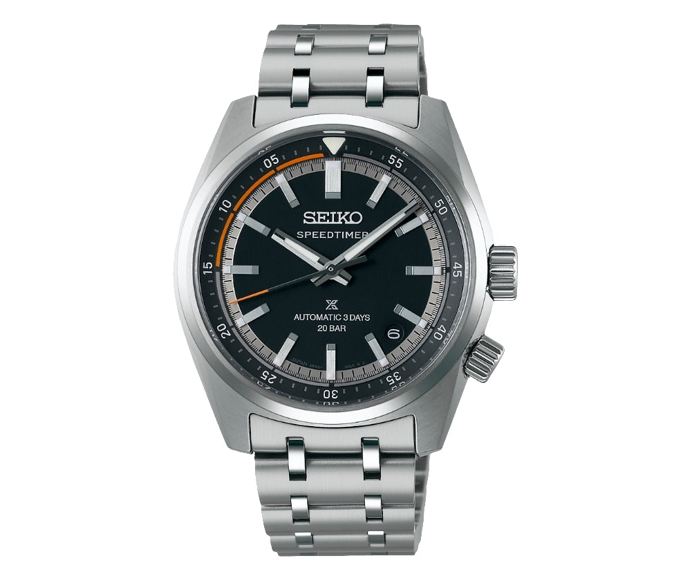 Prospex Speedtimer Mechanical. Seiko Prospex challenges every limit with timepieces created to exceed expectations, engineered with superior style and innovative technology for the sea, sky or land. Driven by a heritage of iconic design, Prospex continues to keep going forward with excellence in precision timekeeping, crafted for the modern world. Based on Seiko’s Speedtimer models of the past, this powerful creation offers superior timekeeping combined with sporty elegance and wearing comfort. Framed by a countdown timer dial ring that can be utilized to measure the remaining time of a particular event, the hairline-finish black dial displays the word “Speedtimer,” honoring Seiko’s legacy of sports timing. The sporty dial is accented by an orange-tipped second hand and offers a date calendar and LumiBrite hands and markers for superior visibility in low light conditions. With an upgraded power reserve of approximately 72 hours, 3 full days, the 24-jewel automatic movement beats at a frequency of 21,600 vibrations per hour with manual winding capability. Crafted of stainless steel with super-hard coating, this rugged yet refined watch is 200 meter water resistant while boasting the slimmest case of any Seiko 6R model, flowing seamlessly from the case to the multi-row bracelet. Topped with a curved sapphire crystal with anti-reflective coating on the inner surface, it includes a screwdown crown and caseback, and a tri-fold push button release clasp.