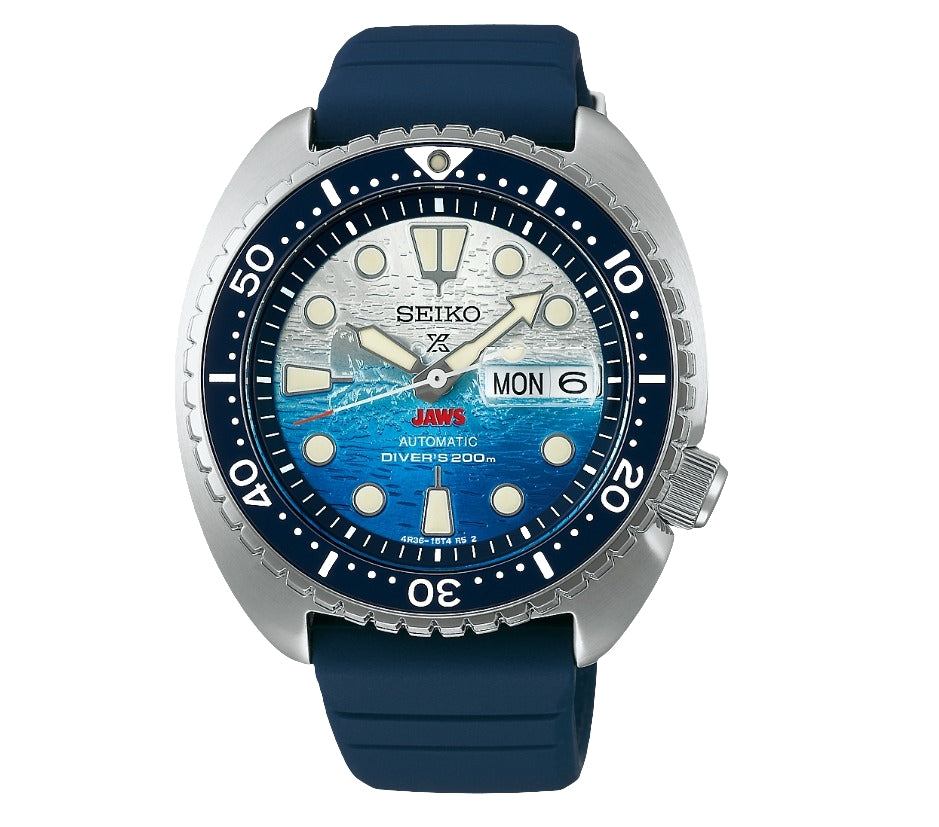 Prospex JAWS 50th Anniversary Limited Edition. Designed for those who treat life as the ultimate adventure, Seiko Prospex challenges every limit with timepieces created to exceed expectations, engineered with superior style and innovative technology for the sea, sky or land. Inspired by the iconic film, JAWS, this incredible and highly collectible Limited Edition is available only in a controlled-production run of 5,000, with the serial number and an image of the “Orca”, the boat made famous by the film and a shark’s dorsal fin engraved on each screwdown caseback. The blue and white ombre dial pattern depicts a memorable scene from the film, and the title logo, “JAWS,” is prominently displayed at the 6 o’clock position. Featuring a magnified day/date calendar and LumiBrite hands and markers, the stunning dial is framed by a navy blue ceramic uni-directional rotating elapsed timing bezel. For reliable timing in rough waters, the 24-jewel automatic movement beats at a frequency of 21,600 vibrations per hour, with a power reserve of approximately 41 hours, with manual winding capability. In stainless steel, with secure screwdown crown and caseback, anti-reflective sapphire crystal and deep blue silicone strap, this high-intensity watch is suitable for scuba diving to depths of 200m. Presented in a Limited Edition JAWS 50th Anniversary collector’s box. 200m Water Resistant