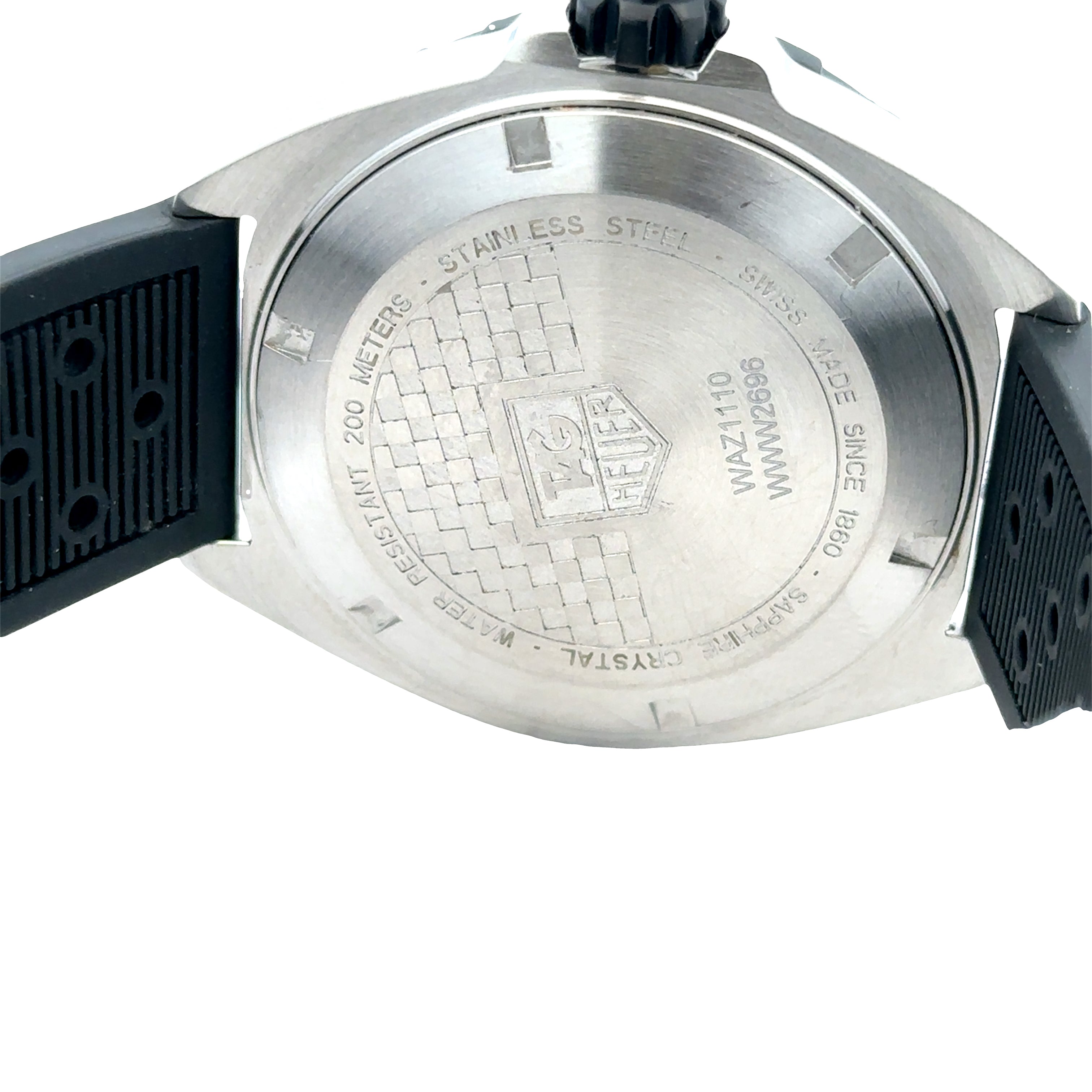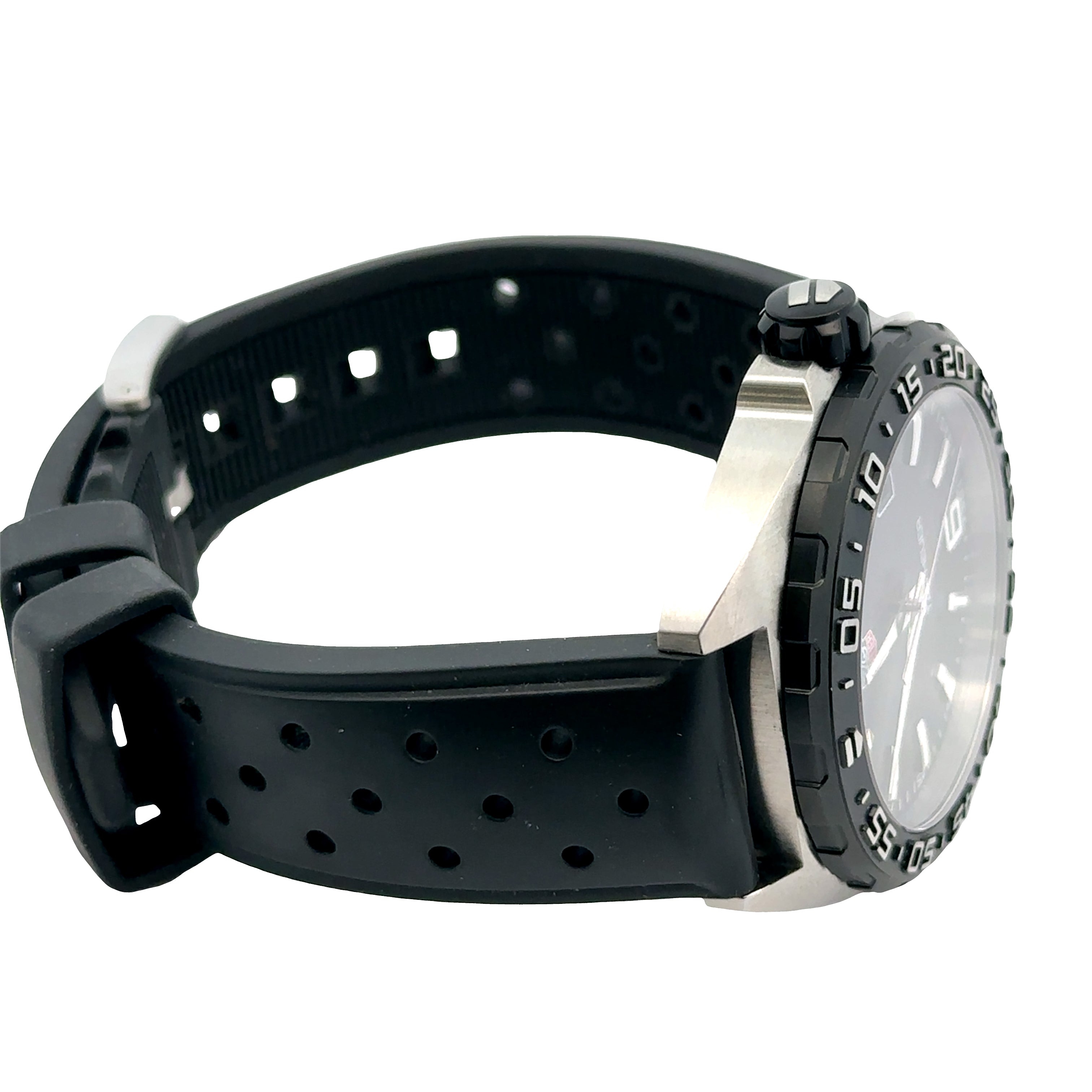 THE TAG HEUER FORMULA 1 WAZ1110.FT8023 IS A BOLD AND SPORTY 41 MM STAINLESS STEEL TIMEPIECE, FEATURING A BLACK OPALIN DIAL AND A UNIDIRECTIONAL BLACK-PVD BEZEL THAT GIVES IT A RUGGED, URBAN EDGE. POWERED BY A RELIABLE SWISS QUARTZ MOVEMENT, IT OFFERS HOURS, MINUTES, SECONDS, AND A DATE FUNCTION, AND INCLUDES A SCREW-DOWN CROWN AND 200 M WATER RESISTANCE FOR REAL DURABILITY. ITS BLACK PERFORATED RUBBER STRAP AND SLEEK DESIGN REFLECT THE SPEED-INSPIRED DNA OF TAG HEUER’S FORMULA 1 COLLECTION, MAKING IT BOTH FUNCTIONAL AND STYLISH.