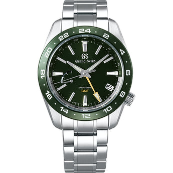 Stainless Steel Grand Seiko Gmt Watch. The Watch Has A Spring Drive Movement With A Power Reserve Up To 72 Hours, Sapphire Crystal With An Anti-Reflective Coating, Green Dial And Bezel With Stick Hour Markers, A Date Window At 3:00, And A Power Reserve Dial At 7:00, Lumibrite Hands And Hour Markers