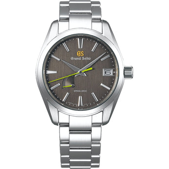 Stainless Steel Grand Seiko Watch, The Spring Drive Mechanical Movement Has A Power Reserve Up To 72 Hours, Sapphire Crystal With An Anti-Reflective Coating On The Inside, Dark Gray Dial With Stick Hour Markers, Green Seconds And Power Reserve Hands, Daate Window At 3:00 On A Bracelet