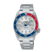 Seiko 5 Sports x Pepsi® Limited Edition. In collaboration with the globally popular beverage brand Pepsi, this exciting Limited Edition is inspired by the heritage design of Seiko 5 Sports and the blue, white, and red colors of Pepsi logos from the 1990s, delivering a bold, retro-inspired style. With vintage styling and colors blending the retro spirit of the 90s with a design updated to suit today’s lifestyles, the superb creation offers a 38mm case diameter with a sleek three-row bracelet for a comfortable fit. This refreshing watch, available only in a controlled production run of 7,000, with the production serial number and the vintage Pepsi logo displayed on the caseback, exudes a sporty aesthetic and a vibrant motif. Providing automatic technology that you control with every movement, the 24-jewel automatic movement beats at a frequency of 21,600 vibrations per hour, with a power reserve of approximately 41 hours and manual winding capability. The silvery white dial, framed by a fan-favorite blue and red rotating bezel, features the iconic Pepsi logo, a day/date calendar, luminous hands and markers, and a blue second hand. Crafted of stainless steel, it is equipped with a locking tri-fold push button release clasp and a screwdown see-through caseback for a view of classic timekeeping in action. A true collector’s item, the must-have timepiece is presented in a Limited Edition Pepsi can-inspired package. 10 bar, 100M Water Resistant.