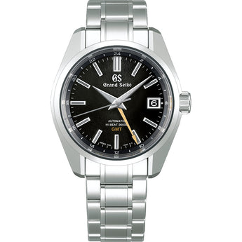Stainless Steel Grand Seiko Hi-Beat 36000 Gmt Watch. Some Of The Watches Features Inlcude A Mechanical Movement With A Power Reserve Up To 55 Hours, A Black Dial With Stick Hour Markers, A 24- Hour Hand, And A Date Window At 3:00, A Sapphire Crystal On The Front And Back Of The Watch With An Anti-Reflective Coating On Inner Surface, On A Bracelet