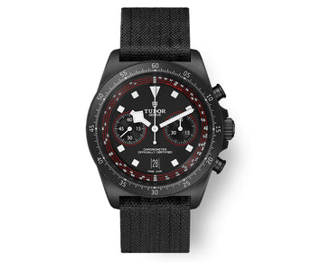 Matte black, red accents on the chronograph counters and tachymeter scale