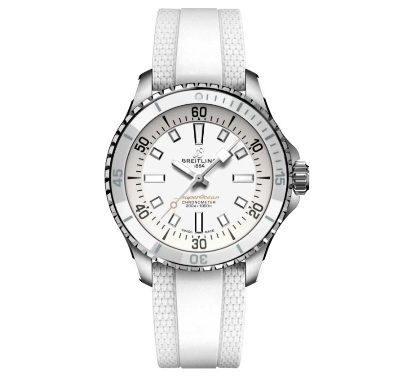 Stainless Steel Breitling Superocean Automatic Watch. The Watch Features A Steel Case, Silver Inside Bezel, White Ceramic Ring. White Markers, Sapphire Crystal, Screw Down Crown And Back,