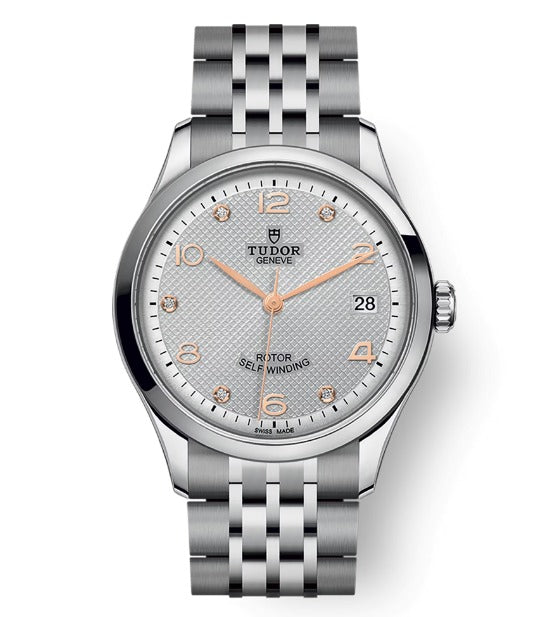 THE TUDOR 1926 M91450‑0003 DAZZLES WITH A 36 MM POLISHED STEEL CASE AND A SHIMMERING SILVER DIAL, ELEGANTLY EMBOSSED AND ACCENTED WITH FIVE SPARKLING DIAMOND HOUR MARKERS THAT CATCH THE LIGHT WITH EVERY MOVEMENT. POWERED BY THE SELF-WINDING CALIBRE T601, IT DELIVERS FLAWLESS MECHANICAL PRECISION WHILE ITS SAPPHIRE CRYSTAL PROTECTS THE DIAL IN ABSOLUTE STYLE. WITH A SEVEN-ROW STEEL BRACELET, SCREW-DOWN CROWN, AND 100 M WATER RESISTANCE, THIS WATCH FUSES TIMELESS ELEGANCE AND EVERYDAY PRACTICALITY, TURNING EVERY WRIST INTO A STATEMENT OF LUXURY, SOPHISTICATION, AND ENDURING PERFORMANCE.
