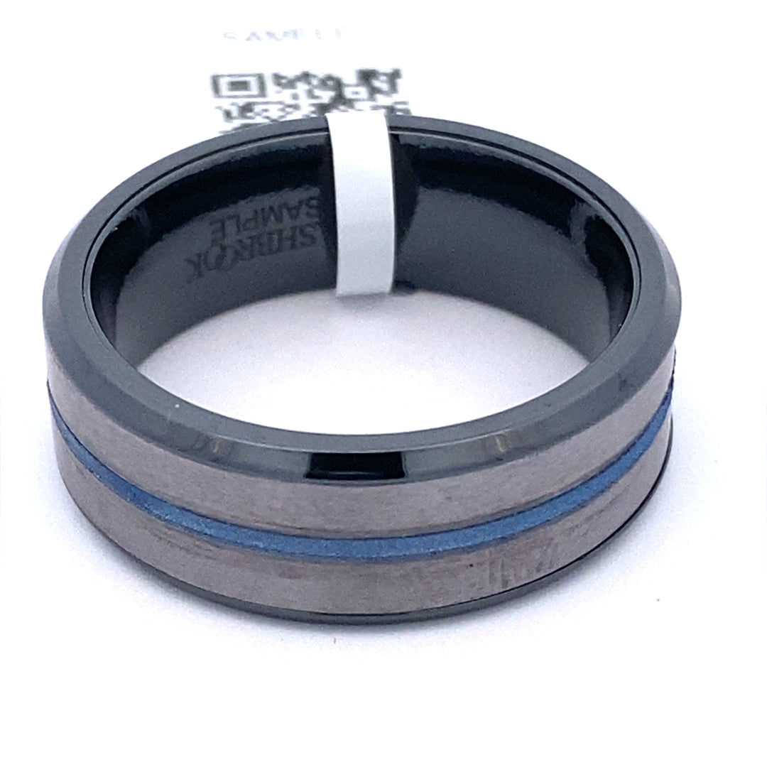 8 mm wide/Beveled/Zirconium band featuring inlays of Tantalum and Polar Blue.